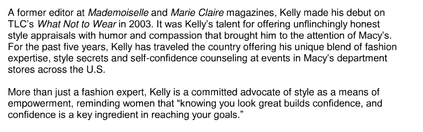 For the past five years, Clinton Kelley has traveled the country offering his unique blend of fashion expertise, style secrets and self-confidence counseling at events in Macy’s department stores across the U.S. More than just a fashion expert, Kelly is a committed advocate of style as a means of empowerment, reminding women (that) “knowing you look great builds confidence, and confidence is a key ingredient in reaching your goals.”