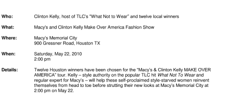 The attached media advisory includes additional event details. You can also download the document here: http://www.docstoc.com/docs/36109443/Macys-and-Clinton-Kelly-MAKE-OVER-Houston-Texas;